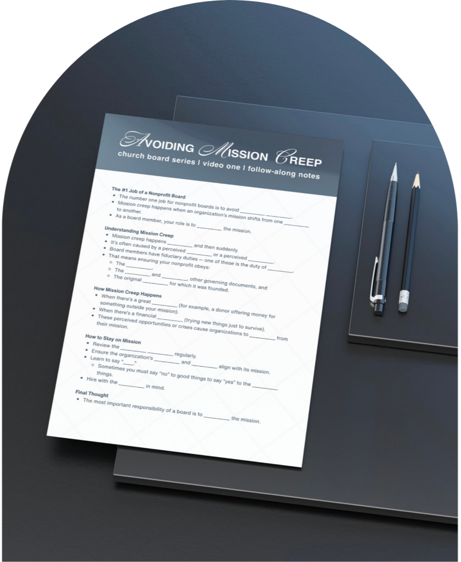 The Church Board Series is a seven-session training designed to help church boards lead with clarity, accountability, and confidence. Created by attorneys who regularly serve churches, this series addresses the real governance questions boards face—so leaders can make wise decisions that protect the mission and the people they serve.
